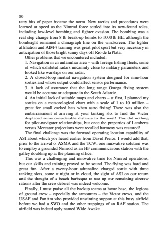 80tatty bits of paper became the norm. New tactics and procedures werelearned at speed as the Nimrod force settled into its new-found roles,including low-level bombing and fighter evasion. The bombing was areal step change from 8 lb break-up bombs to 1000 lb HE, although thebombsight remained a chinagraph line on the windscreen. The fighteraffiliation and AIM-9 training was great pilot sport but very necessary inanticipation of those bright sunny days off Rio de la Plata.Other problems that we encountered included:1. Navigation in an unfamiliar area %u2013 with foreign fishing fleets, someof which exhibited radars uncannily close to military parameters andlooked like warships on our radar.2. A closed-loop inertial navigation system designed for nine-hoursorties and whose output could affect sensor performance.3. A lack of assurance that the long range Omega fixing systemwould be accurate or adequate in the South Atlantic.4. An initial lack of suitable maps and charts %u2013 at first, I planned mysorties on a meteorological chart with a scale of 1 to 10 million %u2013great for small cocked hats when astro fixing! There was also theembarrassment of arriving at your tanking slot to find the Victordisplaced some considerable distance to the west! This did nothingfor pilot-navigator relationships, but once the properties of Lambertsversus Mercator projections were recalled harmony was restored!The final challenge was the forward operating location capability ofASI about which you heard earlier from David Pierce. I would add that,prior to the arrival of ASMA and the TCW, one innovative solution wasto employ a grounded Nimrod as an HF communications station with thegalley doubling up as the planning office.This was a challenging and innovative time for Nimrod operations,but our skills and training proved to be sound. The flying was hard andgreat fun. After a twenty-hour adrenaline charged sortie with threetanking slots, some at night or in cloud, the sight of ASI on our returnand the thought of a beach barbeque to use up our remaining aircrewrations after the crew debrief was indeed welcome.Finally, I must praise all the backup teams at home base, the legionsof ground crew %u2013 especially the armourers %u2013 the Victor crews, and theUSAF and PanAm who provided unstinting support at this busy airfieldbefore we had a SWO and the other trappings of an RAF station. Theairfield was indeed aptly named Wide Awake.