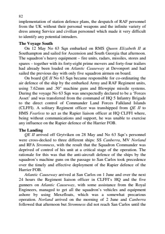 82implementation of station defence plans, the despatch of RAF personnelfrom the UK without their personal weapons and the infinite variety ofdress among Service and civilian personnel which made it very difficultto identify any potential intruders.The Voyage SouthOn 12 May No 63 Sqn embarked on RMS Queen Elizabeth II atSouthampton and sailed for Ascension and South Georgia that afternoon.The squadron%u2019s heavy equipment %u2013 fire units, radars, missiles, stores andspares %u2013 together with its forty-eight prime movers and forty-four trailershad already been loaded on Atlantic Causeway at Devonport and hadsailed the previous day with only five squadron airmen on board.On board QE II No 63 Sqn became responsible for co-ordinating theair defence of the ship by the embarked Army and RAF Regiment units,using 7.62mm and .50\During the voyage No 63 Sqn was unexpectedly declared to be a %u2018ForcesAsset%u2019 and was transferred from the command of HQ 5 Infantry Brigadeto the direct control of Commander Land Forces Falkland Islands(CLFFI). A solitary Regiment officer was transhipped from QE II toHMS Fearless to act as the Rapier liaison officer at HQ CLFFI where,being without communications and support, he was unable to exerciseany influence on the Rapier defence of the Harrier FOB.The LandingQE II arrived off Grytviken on 28 May and No 63 Sqn%u2019s personnelwere cross-decked to three different ships: SS Canberra, MV Norlandand RFA Stromness, with the result that the Squadron Commander wasdeprived of control of his unit at a critical stage of the operation. Therationale for this was that the anti-aircraft defence of the ships by thesquadron%u2019s machine guns on the passage to San Carlos took precedenceover the timely and effective deployment of the Rapier defence of theHarrier FOB.Atlantic Causeway arrived at San Carlos on 1 June and over the next24 hours the Regiment liaison officer in CLFFI%u2019s HQ and the fivegunners on Atlantic Causeway, with some assistance from the RoyalEngineers, managed to get all the squadron%u2019s vehicles and equipmentashore by using Mexefloats, which was a somewhat precariousoperation. Norland arrived on the morning of 2 June and Canberrafollowed that afternoon but Stromness did not reach San Carlos until the