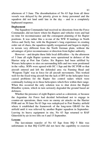83afternoon of 3 June. The disembarkation of No 63 Sqn from all threevessels was delayed by the priority given to Army personnel and thesquadron did not land until late in the day %u2013 and in a completelyhaphazard sequence.DeploymentThe Squadron Commander had received no directions from the ForceCommander, did not know where his Rapiers and vehicles were and hadno time for reconnaissance and the consequent planning of his Rapierpositions. It was rather like a re-run of the WW II landings in NorthAfrica and Sicily but, with the Regiment%u2019s long experience in creatingorder out of chaos, the squadron rapidly reorganised and began to deployin terrain very different from the North German plain, without theadvantages of prior reconnaissance or direction from higher authority.However %u2013 and despite these little local difficulties %u2013 by the afternoonof 3 June all eight Rapier systems were operational in defence of theHarrier strip at Port San Carlos. Six Rapiers had been airlifted byWessex helicopters to sites on surrounding hills and two were positionedin the valley. SOPs were agreed with OC 1 Sqn and the OC FOB so thataircraft entered and left the defended area via Fanning Head and%u2018Weapons Tight%u2019 was in force for all aircraft movements. This workedwell for the fixed-wing aircraft but the lack of IFF in the helicopter forcecaused problems for the Rapier fire control radars which werecontinually locking on to those helicopters which flew within their range.When this occurred the only solution was to shut down the RapierBlindfire system, which in turn seriously degraded the ground based airdefences.Whether the presence of eight Rapiers acted as a deterrent, or becausethe Argentine Air Force had decided beforehand not to engage incounter-air operations, there were no enemy air attacks on the HarrierFOB and on 30 June No 63 Sqn was redeployed to Port Stanley airfieldwhere it established the framework of the long-term GBAD for theairfield until it was relieved by another Rapier squadron in September.Leaving its heavy equipment in situ, No 63 Sqn returned to RAFG%u00fctersloh by air in two lifts on 4 and 15 September.LessonsThe last-minute transfer of No 63 Sqn from HQ 5 Bde wasunfortunate in that HQ CLFFI did not have the capability to exercise
