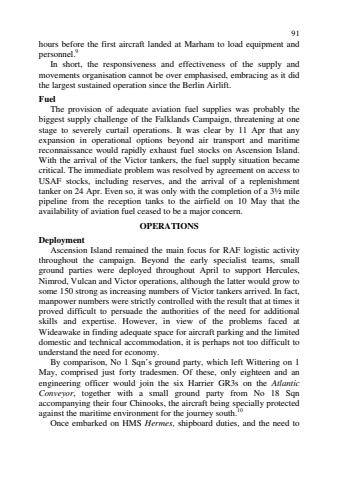91hours before the first aircraft landed at Marham to load equipment andpersonnel.9In short, the responsiveness and effectiveness of the supply andmovements organisation cannot be over emphasised, embracing as it didthe largest sustained operation since the Berlin Airlift.FuelThe provision of adequate aviation fuel supplies was probably thebiggest supply challenge of the Falklands Campaign, threatening at onestage to severely curtail operations. It was clear by 11 Apr that anyexpansion in operational options beyond air transport and maritimereconnaissance would rapidly exhaust fuel stocks on Ascension Island.With the arrival of the Victor tankers, the fuel supply situation becamecritical. The immediate problem was resolved by agreement on access toUSAF stocks, including reserves, and the arrival of a replenishmenttanker on 24 Apr. Even so, it was only with the completion of a 3%u00bd milepipeline from the reception tanks to the airfield on 10 May that theavailability of aviation fuel ceased to be a major concern.OPERATIONSDeploymentAscension Island remained the main focus for RAF logistic activitythroughout the campaign. Beyond the early specialist teams, smallground parties were deployed throughout April to support Hercules,Nimrod, Vulcan and Victor operations, although the latter would grow tosome 150 strong as increasing numbers of Victor tankers arrived. In fact,manpower numbers were strictly controlled with the result that at times itproved difficult to persuade the authorities of the need for additionalskills and expertise. However, in view of the problems faced atWideawake in finding adequate space for aircraft parking and the limiteddomestic and technical accommodation, it is perhaps not too difficult tounderstand the need for economy.By comparison, No 1 Sqn%u2019s ground party, which left Wittering on 1May, comprised just forty tradesmen. Of these, only eighteen and anengineering officer would join the six Harrier GR3s on the AtlanticConveyor, together with a small ground party from No 18 Sqnaccompanying their four Chinooks, the aircraft being specially protectedagainst the maritime environment for the journey south.10Once embarked on HMS Hermes, shipboard duties, and the need to