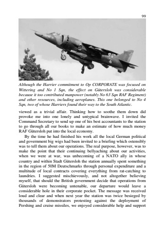 99Although the Harrier commitment to Op CORPORATE was focused onWittering and No 1 Sqn, the effect on G%u00fctersloh was considerablebecause it too contributed manpower (notably No 63 Sqn RAF Regiment)and other resources, including aeroplanes. This one belonged to No 4Sqn, two of whose Harriers found their way to the South Atlantic.viewed as a trivial affair. Thinking how to soothe them down didprovoke me into one lonely and untypical brainwave. I invited theCommand Secretary to send up one of his best accountants to the stationto go through all our books to make an estimate of how much moneyRAF G%u00fctersloh put into the local economy.By the time he had finished his work all the local German politicaland government big wigs had been invited to a briefing which ostensiblywas to tell them about our operations. The real purpose, however, was tomake the point that their continuing bellyaching about our activities,when we were at war, was unbecoming of a NATO ally in whosecountry and within Stadt G%u00fctersloh the station annually spent somethingin the region of 50M Deutschmarks through personal expenditure and amultitude of local contracts covering everything from rat-catching tolaundries. I suggested mischievously, and not altogether believingmyself, that should the British government decide that operations fromG%u00fctersloh were becoming untenable, our departure would leave aconsiderable hole in their corporate pocket. The message was receivedloud and clear and when next year the station was twice besieged bythousands of demonstrators protesting against the deployment ofPershing and cruise missiles, we enjoyed considerable help and support