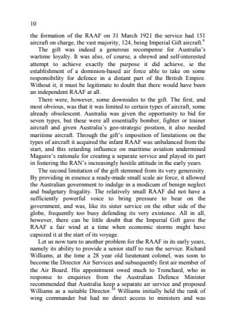 10the formation of the RAAF on 31 March 1921 the service had 151 aircraft on charge, the vast majority, 124, being Imperial Gift aircraft.9 The gift was indeed a generous recompense for Australia%u2019s wartime loyalty. It was also, of course, a shrewd and self8interested attempt to achieve exactly the purpose it did achieve, ie the establishment of a dominion8based air force able to take on some responsibility for defence in a distant part of the British Empire. Without it, it must be legitimate to doubt that there would have been an independent RAAF at all. There were, however, some downsides to the gift. The first, and most obvious, was that it was limited to certain types of aircraft, some already obsolescent. Australia was given the opportunity to bid for seven types, but these were all essentially bomber, fighter or trainer aircraft and given Australia%u2019s geo8strategic position, it also needed maritime aircraft. Through the gift%u2019s imposition of limitations on the types of aircraft it acquired the infant RAAF was unbalanced from the start, and this retarding influence on maritime aviation undermined Maguire%u2019s rationale for creating a separate service and played its part in fostering the RAN%u2019s increasingly hostile attitude in the early years. The second limitation of the gift stemmed from its very generosity. By providing in essence a ready8made small scale air force, it allowed the Australian government to indulge in a modicum of benign neglect and budgetary frugality. The relatively small RAAF did not have a sufficiently powerful voice to bring pressure to bear on the government, and was, like its sister service on the other side of the globe, frequently too busy defending its very existence. All in all, however, there can be little doubt that the Imperial Gift gave the RAAF a fair wind at a time when economic storms might have capsized it at the start of its voyage. Let us now turn to another problem for the RAAF in its early years, namely its ability to provide a senior staff to run the service. Richard Williams, at the time a 28 year old lieutenant colonel, was soon to become the Director Air Services and subsequently first air member of the Air Board. His appointment owed much to Trenchard, who in response to enquiries from the Australian Defence Minister recommended that Australia keep a separate air service and proposed Williams as a suitable Director.10 Williams initially held the rank of wing commander but had no direct access to ministers and was