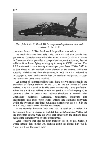 102courses to Pearce AFB at Perth until the problem was solved. At much the same time, July 1999, the RAF had also bought into yet another Canadian enterprise, the NFTC %u2013 NATO Flying Trainingin Canada %u2013 which provides a comprehensive, contractor8run, fast8jet syllabus from basic flying training up to entry to OCU standard. The RAF undertook to send twenty students per year from 2000 to 2020 to do just Phase IV, the tactical Hawk element of the course. While not actually %u2018withdrawing%u2019 from the scheme, in 2008 the RAF %u2018reduced its throughput to zero%u2019 and once the last UK students had passed through the seven RAF QFIs were recalled. An aspect of internationalism that I have not yet mentioned is the provision of flying training in the UK, to the air forces of other nations. The RAF used to do this quite extensively %u2013 and profitably. When No 6 FTS was failing to train me (and a lot of other people) to become a pilot in 1960, I was rubbing shoulders at Ternhill with Ghanaians, Sudanese, Lebanese, Jordanians, Malayans and Indonesians (and there were Iraqis, Syrians and Kenyans elsewhere within the system at that time) but, as an instructor at No 6 FTS in the mid81970s, I taught only Nigerian navigators. More recently, between 2004 and 2007 a total of 72 Indian Air Force pilots (twelve courses of six) did the Hawk Course at Valley but the thirteenth course were all QFIs and since then the Indians have been doing it themselves on their own Hawks. And I believe that that has been more or less it, of late. Sadly, it would appear that, in the UK training game, as Lionel Bart put it, %u2018Fings ain%u2019t wot they used to be.%u2019 One of the CT?155 Hawk Mk 115s operated by Bombardier under contract to the NFTC.