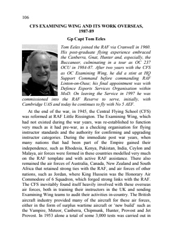 106%u0009%u0008%u000c%u0006C%u0004ffi%u0007%u0010%u0007%u00103%u0006#%u0007%u00103%u0006%u0004%u0010%u0018%u0006%u0007%u000c%u0006#%u00016%u0006%u001a%u0001%u000c%u0004%u000cffl%u0006\3B%u0006%u0009(B%u0016%u0006%u0013%u0014%u0006%u0017+%u0017)%u0006Tom Eeles joined the RAF via Cranwell in 1960. His post?graduate flying experience embraced the Canberra, Gnat, Hunter and, especially, the Buccaneer, culminating in a tour as OC 237 OCU in 1984?87. After two years with the CFS as OC Examining Wing, he did a stint at HQ Support Command before commanding RAF Linton?on?Ouse; his final appointment was with Defence Exports Services Organisation within MoD. On leaving the Service in 1997 he was commissioned into the RAF Reserve to serve, initially, with Cambridge UAS and today he continues to fly with No 5 AEF. At the end of the war, in 1945, the Central Flying School (CFS) was reformed at RAF Little Rissington. The Examining Wing, which had not existed during the war years, was re8established to function very much as it had pre8war, as a checking organisation for flying instructor standards and the authority for confirming and upgrading instructor categories. During the immediate post war years, when many nations that had been part of the Empire gained their independence, such as Rhodesia, Kenya, Pakistan, India, Ceylon and Malaya, air forces were formed in these countries modelled very much on the RAF template and with active RAF assistance. There also remained the air forces of Australia, Canada, New Zealand and South Africa that retained strong ties with the RAF, and air forces of other nations, such as Jordan, where King Hussein was the Honorary Air Commodore of 6 Squadron, which forged strong links with the RAF. The CFS inevitably found itself heavily involved with these overseas air forces, both in training their instructors in the UK and sending Examining Wing teams to audit their activities in8country. The British aircraft industry provided many of the aircraft for these air forces, either in the form of surplus wartime aircraft or %u2018new build%u2019 such as the Vampire, Meteor, Canberra, Chipmunk, Hunter, Provost and Jet Provost. In 1953 alone a total of some 3,000 tests was carried out in