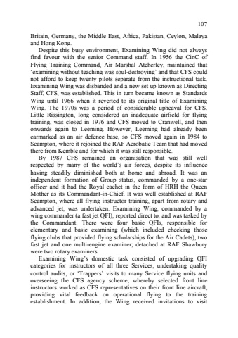 107Britain, Germany, the Middle East, Africa, Pakistan, Ceylon, Malaya and Hong Kong. Despite this busy environment, Examining Wing did not always find favour with the senior Command staff. In 1956 the CinC of Flying Training Command, Air Marshal Atcherley, maintained that %u2018examining without teaching was soul8destroying%u2019 and that CFS could not afford to keep twenty pilots separate from the instructional task. Examining Wing was disbanded and a new set up known as Directing Staff, CFS, was established. This in turn became known as Standards Wing until 1966 when it reverted to its original title of Examining Wing. The 1970s was a period of considerable upheaval for CFS. Little Rissington, long considered an inadequate airfield for flying training, was closed in 1976 and CFS moved to Cranwell, and then onwards again to Leeming. However, Leeming had already been earmarked as an air defence base, so CFS moved again in 1984 to Scampton, where it rejoined the RAF Aerobatic Team that had moved there from Kemble and for which it was still responsible. By 1987 CFS remained an organisation that was still well respected by many of the world%u2019s air forces, despite its influence having steadily diminished both at home and abroad. It was an independent formation of Group status, commanded by a one8star officer and it had the Royal cachet in the form of HRH the Queen Mother as its Commandant8in8Chief. It was well established at RAF Scampton, where all flying instructor training, apart from rotary and advanced jet, was undertaken. Examining Wing, commanded by a wing commander (a fast jet QFI), reported direct to, and was tasked by the Commandant. There were four basic QFIs, responsible for elementary and basic examining (which included checking those flying clubs that provided flying scholarships for the Air Cadets), two fast jet and one multi8engine examiner; detached at RAF Shawbury were two rotary examiners. Examining Wing%u2019s domestic task consisted of upgrading QFI categories for instructors of all three Services, undertaking quality control audits, or %u2018Trappers%u2019 visits to many Service flying units and overseeing the CFS agency scheme, whereby selected front line instructors worked as CFS representatives on their front line aircraft, providing vital feedback on operational flying to the training establishment. In addition, the Wing received invitations to visit
