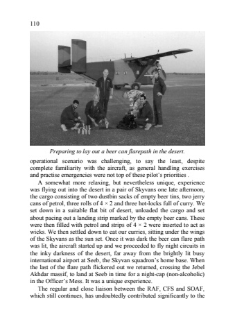 110operational scenario was challenging, to say the least, despite complete familiarity with the aircraft, as general handling exercises and practise emergencies were not top of these pilot%u2019s priorities . A somewhat more relaxing, but nevertheless unique, experience was flying out into the desert in a pair of Skyvans one late afternoon, the cargo consisting of two dustbin sacks of empty beer tins, two jerry cans of petrol, three rolls of 4 %u00d7 2 and three hot8locks full of curry. We set down in a suitable flat bit of desert, unloaded the cargo and set about pacing out a landing strip marked by the empty beer cans. These were then filled with petrol and strips of 4 %u00d7 2 were inserted to act as wicks. We then settled down to eat our curries, sitting under the wings of the Skyvans as the sun set. Once it was dark the beer can flare path was lit, the aircraft started up and we proceeded to fly night circuits in the inky darkness of the desert, far away from the brightly lit busy international airport at Seeb, the Skyvan squadron%u2019s home base. When the last of the flare path flickered out we returned, crossing the Jebel Akhdar massif, to land at Seeb in time for a night8cap (non8alcoholic) in the Officer%u2019s Mess. It was a unique experience. The regular and close liaison between the RAF, CFS and SOAF, which still continues, has undoubtedly contributed significantly to the Preparing to lay out a beer can flarepath in the desert.