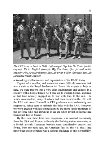 111acknowledged effectiveness and organisation of the RAFO today. Typical of a smaller, and somewhat more difficult, overseas task was a visit to the Royal Jordanian Air Force. No ex8pats to help us here, we were thrown into a very alien environment and culture, in a country with a hostile Israeli Air Force on its western border, and Iraq, at that time actively engaged in its war with Iran, to the east. The senior commanders, many of whom had been trained in the UK with the RAF and were Cranwell or CFS graduates were welcoming and supportive, being keen to maintain the links with the RAF. However, we were greeted with less enthusiasm by the more junior members of the air force who had grown up in an era when British influence had been much less in Jordan. By this time their front line equipment was sourced exclusively from the USA and France, with only the Bulldog trainer remaining as a British aircraft. Language barriers were considerably greater, and flying, from the back seat, an American fast jet, the F85, that I had never been close to before was a serious challenge to one%u2019s credibility. The CFS team at Seeb in 1988. Left to right: Sqn Ldr Da Costa (multi?engine); Flt Lt English (rotary); Wg Cdr Eeles (fast jet and multi?engine); Flt Lt Foster (basic); Sqn Ldr Brian Fuller (fast jet); Sqn Ldr Lawrence (multi?engine).