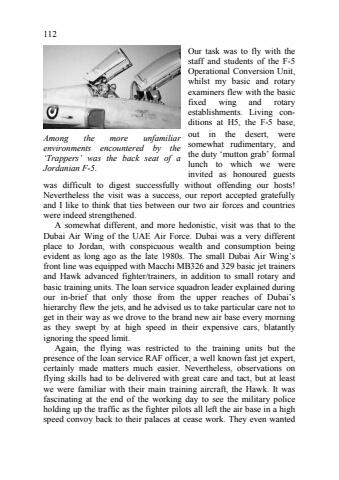 112Our task was to fly with the staff and students of the F85 Operational Conversion Unit, whilst my basic and rotary examiners flew with the basic fixed wing and rotary establishments. Living con8ditions at H5, the F85 base, out in the desert, were somewhat rudimentary, and the duty %u2018mutton grab%u2019 formal lunch to which we were invited as honoured guests was difficult to digest successfully without offending our hosts!Nevertheless the visit was a success, our report accepted gratefully and I like to think that ties between our two air forces and countries were indeed strengthened. A somewhat different, and more hedonistic, visit was that to the Dubai Air Wing of the UAE Air Force. Dubai was a very different place to Jordan, with conspicuous wealth and consumption being evident as long ago as the late 1980s. The small Dubai Air Wing%u2019s front line was equipped with Macchi MB326 and 329 basic jet trainers and Hawk advanced fighter/trainers, in addition to small rotary and basic training units. The loan service squadron leader explained during our in8brief that only those from the upper reaches of Dubai%u2019s hierarchy flew the jets, and he advised us to take particular care not to get in their way as we drove to the brand new air base every morning as they swept by at high speed in their expensive cars, blatantly ignoring the speed limit. Again, the flying was restricted to the training units but the presence of the loan service RAF officer, a well known fast jet expert, certainly made matters much easier. Nevertheless, observations on flying skills had to be delivered with great care and tact, but at least we were familiar with their main training aircraft, the Hawk. It was fascinating at the end of the working day to see the military police holding up the traffic as the fighter pilots all left the air base in a high speed convoy back to their palaces at cease work. They even wanted Among the more unfamiliar environments encountered by the %u2018Trappers%u2019 was the back seat of a Jordanian F?5.