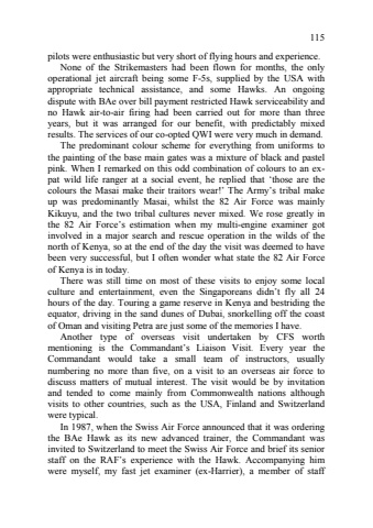 115pilots were enthusiastic but very short of flying hours and experience. None of the Strikemasters had been flown for months, the only operational jet aircraft being some F85s, supplied by the USA with appropriate technical assistance, and some Hawks. An ongoing dispute with BAe over bill payment restricted Hawk serviceability and no Hawk air8to8air firing had been carried out for more than three years, but it was arranged for our benefit, with predictably mixed results. The services of our co8opted QWI were very much in demand. The predominant colour scheme for everything from uniforms to the painting of the base main gates was a mixture of black and pastel pink. When I remarked on this odd combination of colours to an ex8pat wild life ranger at a social event, he replied that %u2018those are the colours the Masai make their traitors wear!%u2019 The Army%u2019s tribal make up was predominantly Masai, whilst the 82 Air Force was mainly Kikuyu, and the two tribal cultures never mixed. We rose greatly in the 82 Air Force%u2019s estimation when my multi8engine examiner got involved in a major search and rescue operation in the wilds of the north of Kenya, so at the end of the day the visit was deemed to have been very successful, but I often wonder what state the 82 Air Force of Kenya is in today. There was still time on most of these visits to enjoy some local culture and entertainment, even the Singaporeans didn%u2019t fly all 24 hours of the day. Touring a game reserve in Kenya and bestriding the equator, driving in the sand dunes of Dubai, snorkelling off the coast of Oman and visiting Petra are just some of the memories I have. Another type of overseas visit undertaken by CFS worth mentioning is the Commandant%u2019s Liaison Visit. Every year the Commandant would take a small team of instructors, usually numbering no more than five, on a visit to an overseas air force to discuss matters of mutual interest. The visit would be by invitation and tended to come mainly from Commonwealth nations although visits to other countries, such as the USA, Finland and Switzerland were typical. In 1987, when the Swiss Air Force announced that it was ordering the BAe Hawk as its new advanced trainer, the Commandant was invited to Switzerland to meet the Swiss Air Force and brief its senior staff on the RAF%u2019s experience with the Hawk. Accompanying him were myself, my fast jet examiner (ex8Harrier), a member of staff
