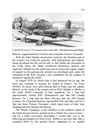 119Beavers, supplemented by Caribou and eventually Vickers Viscounts. With the Jebel Akhdar insurrection resolved, the Northern part of the Country was relatively peaceful, with infrastructure and industry being developed but this served only to fuel further the discontent in the south where the Jebali considered themselves ignored and neglected. Salalah was the main town and to ensure the regular supply of support to the garrison the airfield was developed and, under the command of the RAF, became a key installation for the conduct of operations against the rebels. In August 1970, by which time it had embraced the jet age, the force was renamed to become the Sultan of Oman%u2019s Air Force (SOAF). Its assets were split between Bait al Falaj, near the capital, Muscat, in the north of the country and at RAF Salalah in Dhofar in the south. SOAF consisted of four squadrons: No 1 Sqn had approximately sixteen BAC Strikemasters and four DH Canada Beavers; No 2 Sqn had ten Short Skyvans and two DH Canada Caribou; No 3 Sqn had fourteen Agusta8Bell 205s and 206s, and No 4 Sqn had three Vickers Viscounts, which spent most of their time shuttling between Salalah and Muscat. The Dhofar Campaign, as the rebellion in the southern region of the Oman became known, ground on for a further five years or more %u2013 and for a fuller eyewitness description I would refer you to the following presentation by Denis Grey. Suffice to say here that, after a sustained effort by the ground forces, supported by an equally A SOAF Provost T.52 armed with 3?inch RPs. (Richard Grevatte8Ball)