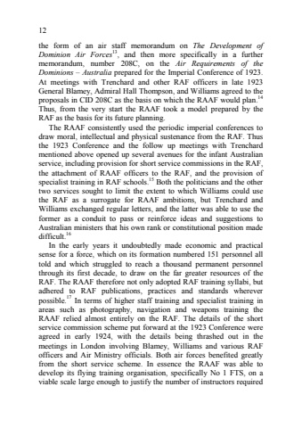 12the form of an air staff memorandum on The Development of Dominion Air Forces13, and then more specifically in a further memorandum, number 208C, on the Air Requirements of the Dominions %u2013 Australia prepared for the Imperial Conference of 1923. At meetings with Trenchard and other RAF officers in late 1923 General Blamey, Admiral Hall Thompson, and Williams agreed to the proposals in CID 208C as the basis on which the RAAF would plan.14Thus, from the very start the RAAF took a model prepared by the RAF as the basis for its future planning. The RAAF consistently used the periodic imperial conferences to draw moral, intellectual and physical sustenance from the RAF. Thus the 1923 Conference and the follow up meetings with Trenchard mentioned above opened up several avenues for the infant Australian service, including provision for short service commissions in the RAF, the attachment of RAAF officers to the RAF, and the provision of specialist training in RAF schools.15 Both the politicians and the other two services sought to limit the extent to which Williams could use the RAF as a surrogate for RAAF ambitions, but Trenchard and Williams exchanged regular letters, and the latter was able to use the former as a conduit to pass or reinforce ideas and suggestions to Australian ministers that his own rank or constitutional position made difficult.16 In the early years it undoubtedly made economic and practical sense for a force, which on its formation numbered 151 personnel all told and which struggled to reach a thousand permanent personnel through its first decade, to draw on the far greater resources of the RAF. The RAAF therefore not only adopted RAF training syllabi, but adhered to RAF publications, practices and standards wherever possible.17 In terms of higher staff training and specialist training in areas such as photography, navigation and weapons training the RAAF relied almost entirely on the RAF. The details of the short service commission scheme put forward at the 1923 Conference were agreed in early 1924, with the details being thrashed out in the meetings in London involving Blamey, Williams and various RAF officers and Air Ministry officials. Both air forces benefited greatly from the short service scheme. In essence the RAAF was able to develop its flying training organisation, specifically No 1 FTS, on a viable scale large enough to justify the number of instructors required