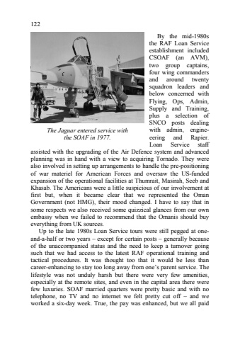 122 By the mid81980s the RAF Loan Service establishment included CSOAF (an AVM), two group captains, four wing commanders and around twenty squadron leaders and below concerned with Flying, Ops, Admin, Supply and Training, plus a selection of SNCO posts dealing with admin, engine8eering and Rapier. Loan Service staff assisted with the upgrading of the Air Defence system and advanced planning was in hand with a view to acquiring Tornado. They were also involved in setting up arrangements to handle the pre8positioning of war materiel for American Forces and oversaw the US8funded expansion of the operational facilities at Thumrait, Masirah, Seeb and Khasab. The Americans were a little suspicious of our involvement at first but, when it became clear that we represented the Oman Government (not HMG), their mood changed. I have to say that in some respects we also received some quizzical glances from our own embassy when we failed to recommend that the Omanis should buy everything from UK sources. Up to the late 1980s Loan Service tours were still pegged at one8and8a8half or two years %u2013 except for certain posts %u2013 generally because of the unaccompanied status and the need to keep a turnover going such that we had access to the latest RAF operational training and tactical procedures. It was thought too that it would be less than career8enhancing to stay too long away from one%u2019s parent service. The lifestyle was not unduly harsh but there were very few amenities, especially at the remote sites, and even in the capital area there were few luxuries. SOAF married quarters were pretty basic and with no telephone, no TV and no internet we felt pretty cut off %u2013 and we worked a six8day week. True, the pay was enhanced, but we all paid The Jaguar entered service with the SOAF in 1977.