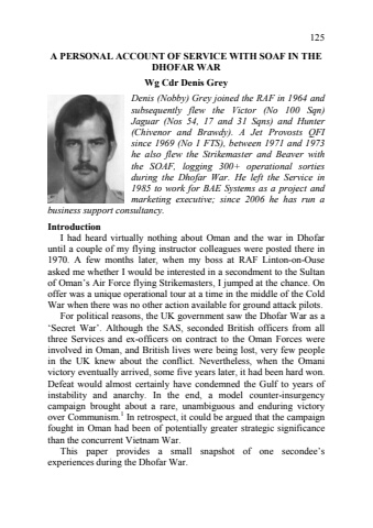 125%u0004%u0006fi%u0001%u000c%u0010%u0004%u0005%u0006%u0004%u0009%u0009%u000f%u0010%u0006%u0008%u0006%u000c%u0001%u001a%u0007%u0009%u0006#%u0007%u000b%u0006%u000c%u0004%u0008%u0006%u0007%u0010%u0006%u000b%u0006%u0018%u000b%u0008%u0004%u0001%u0006#%u0004%u0001%u0006#,%u0006%u0009-%%u0006%u0018%u0017/%u0015)%u00063%%u00178Denis (Nobby) Grey joined the RAF in 1964 and subsequently flew the Victor (No 100 Sqn) Jaguar (Nos 54, 17 and 31 Sqns) and Hunter (Chivenor and Brawdy). A Jet Provosts QFI since 1969 (No 1 FTS), between 1971 and 1973 he also flew the Strikemaster and Beaver with the SOAF, logging 300+ operational sorties during the Dhofar War. He left the Service in 1985 to work for BAE Systems as a project and marketing executive; since 2006 he has run a business support consultancy. %u0007/%u0016%%u0013-4&%u0016%u0015%u0013/%u0006 I had heard virtually nothing about Oman and the war in Dhofar until a couple of my flying instructor colleagues were posted there in 1970. A few months later, when my boss at RAF Linton8on8Ouse asked me whether I would be interested in a secondment to the Sultan of Oman%u2019s Air Force flying Strikemasters, I jumped at the chance. On offer was a unique operational tour at a time in the middle of the Cold War when there was no other action available for ground attack pilots. For political reasons, the UK government saw the Dhofar War as a %u2018Secret War%u2019. Although the SAS, seconded British officers from all three Services and ex8officers on contract to the Oman Forces were involved in Oman, and British lives were being lost, very few people in the UK knew about the conflict. Nevertheless, when the Omani victory eventually arrived, some five years later, it had been hard won. Defeat would almost certainly have condemned the Gulf to years of instability and anarchy. In the end, a model counter8insurgency campaign brought about a rare, unambiguous and enduring victory over Communism.1 In retrospect, it could be argued that the campaign fought in Oman had been of potentially greater strategic significance than the concurrent Vietnam War. This paper provides a small snapshot of one secondee%u2019s experiences during the Dhofar War.