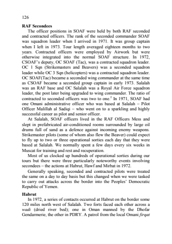 126%u0001%u0004%u0008%u0006%u000c%u0017&%u0013/-%u0017%u0017)%u0006 The officer positions in SOAF were held by both RAF seconded and contracted officers. The rank of the seconded commander SOAF was squadron leader when I arrived in 1971. It was group captain when I left in 1973. Tour length averaged eighteen months to two years. Contracted officers were employed by Airwork but were otherwise integrated into the normal SOAF structure. In 1972, CSOAF%u2019s deputy, OC SOAF (Tac), was a contracted squadron leader. OC 1 Sqn (Strikemasters and Beavers) was a seconded squadron leader while OC 3 Sqn (helicopters) was a contracted squadron leader. OC SOAF(Tac) became a seconded wing commander at the same time as CSOAF became a seconded group captain in early 1973. Salalah was an RAF base and OC Salalah was a Royal Air Force squadron leader, the post later being upgraded to wing commander. The ratio of contracted to seconded officers was two to one.2 In 1971, SOAF had one Omani administrative officer who was based at Salalah %u2013 Pilot Officer Malillah al Sadiqi %u2013 who went on to a sparkling and highly successful career as pilot and senior officer. At Salalah, SOAF officers lived in the RAF Officers Mess and slept in prefabricated air8conditioned rooms surrounded by large oil drums full of sand as a defence against incoming enemy weapons. Strikemaster pilots (some of whom also flew the Beaver) could expect to fly up to two or three operational sorties each day that they were based at Salalah. We normally spent a few days every six weeks in Muscat for training and rest and recuperation. Most of us clocked up hundreds of operational sorties during our tours but there were three particularly noteworthy events involving secondees %u2013 the actions at Habrut, Hawf and Mirbat in 1972. Generally speaking, seconded and contracted pilots were treated the same on a day to day basis but this changed when we were tasked to carry out attacks across the border into the Peoples%u2019 Democratic Republic of Yemen. %u000b(0%4%u0016%u0006 In 1972, a series of contacts occurred at Habrut on the border some 120 miles north west of Salalah. Two forts faced each other across a wadi (dried river bed); one in Oman manned by the Dhofar Gendarmerie, the other in PDRY. A patrol from the local Omani firqat
