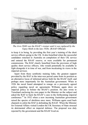 13to keep it in being, by providing the first year%u2019s training of the short service officers going to the UK. It also benefited when the successful candidates returned to Australia on completion of their UK service and entered the RAAF reserve, or were available for permanent commissions. The RAF clearly benefited from the provision of high quality short service officers, who would potentially be available to fight alongside it in time of war, and from inculcating its views in the imperial services. Apart from these symbiotic training links, the greatest support provided by the RAF in the inter8war period came from its position as an alternative locus of informed advice both for the RAAF itself, and perhaps more importantly for the Australian government. When in 1926 the naval board attempted to renege on a previously agreed policy regarding naval air agreements Williams again drew on imperial policy to bolster the RAAF%u2019s position. He also wrote to Trenchard enclosing his own paper to the Minister on the subject and asked the RAF to back the RAAF%u2019s case in the forthcoming imperial conference.18 In 1932 when a new incoming Australian government raised the spectre of abolition once more, Williams again used back channels to enlist the RAF in defending the RAAF. When the Minister for External Affairs visited London the UK Secretary of State stressed its detrimental effect on imperial defence. The proposal was duly rejected by the government and the RAAF lived on. The Avro 504K was the RAAF%u2019s trainer until it was replaced by the Gipsy Moth in the late 1920s. (RAAF Official)