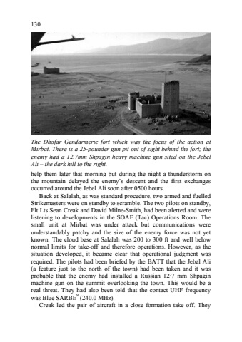 130help them later that morning but during the night a thunderstorm on the mountain delayed the enemy%u2019s descent and the first exchanges occurred around the Jebel Ali soon after 0500 hours. Back at Salalah, as was standard procedure, two armed and fuelled Strikemasters were on standby to scramble. The two pilots on standby, Flt Lts Sean Creak and David Milne8Smith, had been alerted and were listening to developments in the SOAF (Tac) Operations Room. The small unit at Mirbat was under attack but communications were understandably patchy and the size of the enemy force was not yet known. The cloud base at Salalah was 200 to 300 ft and well below normal limits for take8off and therefore operations. However, as the situation developed, it became clear that operational judgment was required. The pilots had been briefed by the BATT that the Jebal Ali (a feature just to the north of the town) had been taken and it was probable that the enemy had installed a Russian 12c7 mm Shpagin machine gun on the summit overlooking the town. This would be a real threat. They had also been told that the contact UHF frequency was Blue SARBE9 (240.0 MHz). Creak led the pair of aircraft in a close formation take off. They The Dhofar Gendarmerie fort which was the focus of the action at Mirbat. There is a 25?pounder gun pit out of sight behind the fort; the enemy had a 12.7mm Shpagin heavy machine gun sited on the Jebel Ali %u2013 the dark hill to the right.