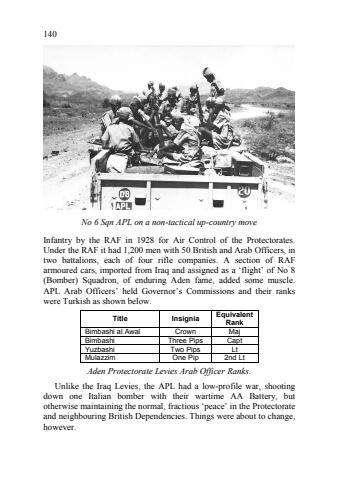 140Infantry by the RAF in 1928 for Air Control of the Protectorates. Under the RAF it had 1,200 men with 50 British and Arab Officers, in two battalions, each of four rifle companies. A section of RAF armoured cars, imported from Iraq and assigned as a %u2018flight%u2019 of No 8 (Bomber) Squadron, of enduring Aden fame, added some muscle. APL Arab Officers%u2019 held Governor%u2019s Commissions and their ranks were Turkish as shown below. %u0006%u000f%u0003%u0004%u0005 1%u001a\67!%u000f3%u0004%u001a%u0003%u0005%u0012%u001a8%u0005%u0007%u000c%u001affl'%u000b%u000c%u0001ffl%u0008%u0001)+ffl%u0008%u0001%u0001 2ffi%u0003+%u0001 &fflG%u0001%u0007%u000c%u001affl'%u000b%u000c%u0001 ;%u000bffi%u0009%u0009%u0001:%u000c%u0011'%u0001 2ffl%u0011%u0012%u0001>fl=%u001affl'%u000b%u000c%u0001 ;+%u0003%u0001:%u000c%u0011'%u0001 F%u0012%u0001&fl%u0008ffl==%u000c%u0001 %u0009%u0001:%u000c%u0011%u0001 %u0015$%u0001F%u0012%u0001Aden Protectorate Levies Arab Officer Ranks. Unlike the Iraq Levies, the APL had a low8profile war, shooting down one Italian bomber with their wartime AA Battery, but otherwise maintaining the normal, fractious %u2018peace%u2019 in the Protectorate and neighbouring British Dependencies. Things were about to change, however.No 6 Sqn APL on a non?tactical up?country move