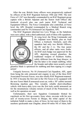 141 After the war, British Army officers were progressively replaced by officers of the RAF Regiment between 1946 and 1948. The new Force of 1,347 was thereafter commanded by an RAF Regiment group captain with a British Adjutant and the Senior Arab Officer (the bimbashi al?awal) plus one each junior RAF Technical and Equipment Officers. The Force Commander also controlled, at Force level, the APL Hospital (commanded by a Medical Branch wing commander) and No 10 (Armoured Car) Squadron, APL. The RAF Regiment inherited two Levy Wings, as the battalions were now called, with a third authorised, each of three rifle squadrons. At wing level, the Wing Commander and his Adjutant were British, plus an Arab Officer, a bimbashi. Similarly, each rifle squadron had only two British Officers, the OC and the 2 i/c. The four junior officers, and all other ranks were Arabs. An RAF8style badge was approved for the APL, depicting crossed ghambias, the traditional weapon of Southern Arabia, subtly different from the Iraqi khunjar, in that the latter is for simple stabbing, while the broader and rather more acutely curved ghambia blade is optimised for stabbing and then ripping in a single action! Uniquely however, No 10 (Armoured Car) Squadron, APL, apart from being the only armoured unit organic to any of the three RAF Associated Overseas Forces, was also wholly RAF Regiment8manned. In 1955 it became the first unit in the UK Forces to be equipped with the new Ferret Mark II armoured scout car, with a c30\Browning machine gun. This versatile, reliable short8wheelbase vehicle with heavy8duty tyres was the first truly useful armoured car for the mountainous volcanic terrain of much of the Protectorate, as well as for operation on sand. Unfortunately, their new Squadron Commander blotted his copybook on his first up8country foray when, en8route with his new unit of twenty8seven Ferrets to Shuqra, the tribal capital of the turbulent Fahdli to make a show of force, he lost most of them to the seashore quicksands near Zingibar, about 40 miles NE of Aden, half8