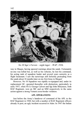 142way to Shuqra, having ignored warnings about the sands. Fortunately no8one was killed but, as well as his vehicles, he lost his command, his acting rank of squadron leader and several years seniority as a flight lieutenant. I saw the turret8tops still forlornly protruding from the sands about 18 months later on my first foray to Shuqra! However, No 10 Squadron was rapidly re8equipped and, under its replacement OC, operated thereafter with distinction, particularly in early 1957, when Flt Lt George Calvert and Sgt John Molyneux, both RAF Regiment, won an MC and an MM respectively in the same action against a strong Yemeni cross8border violation. %u0004fi%u0005%u0006fi%u0001%u0004%u0007%u0010%u000c%u0006 Just before the Army%u2019s handover of command of the APL to the RAF Regiment in 1948, but with a number of RAF Regiment officers already in post, an ugly incident occurred in Aden. In 1947 the Indian No 10 Sqn%u2019s Ferrets %u2013 night lager %u2013 WAP, 1956.