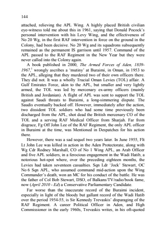 144attached, relieving the APL Wing. A highly placed British civilian eye8witness told me about this in 1961, saying that Donald Pocock%u2019s personal intervention with his Levy Wing, and the effectiveness of No 20 Wg, in the first RAF intervention in force on the ground in the Colony, had been decisive. No 20 Wg and its squadrons subsequently remained as the permanent IS garrison until 1957. Command of the APL passed to the RAF Regiment in the New Year but they were never called into the Colony again. A book published in 2000, The Armed Forces of Aden, 1839?1967,1 wrongly ascribes a %u2018mutiny%u2019 at Buraimi, in Oman, in 1953 to the APL, alleging that they murdered two of their own officers there. They did not. It was a wholly Trucial Oman Levies (TOL) affair. A Gulf Emirates Force, akin to the APL, but smaller and very lightly armed, the TOL was led by mercenary ex8army officers (mainly British and Jordanian). A flight of APL was sent to support the TOL against Saudi threats to Buraimi, a long8simmering dispute. The Saudis eventually backed off. However, immediately after the action, two dissident TOL soldiers who had some time previously been discharged from the APL, shot dead the British mercenary CO of the TOL and a serving RAF Medical Officer from Sharjah. Far from disgrace, Fg Off John Lee of the RAF Regiment, the only APL officer in Buraimi at the time, was Mentioned in Despatches for his action there. However, there was a sad sequel two years later. In June 1955, Flt Lt John Lee was killed in action in the Aden Protectorate, along with Wg Cdr Rodney Marshall, CO of No 1 Wing APL, an Arab Officer and five APL soldiers, in a ferocious engagement in the Wadi Hatib, a notorious hot8spot where, over the preceding eighteen months, the Levies had taken seventeen casualties. Sqn Ldr %u2018Jock%u2019 Stewart, OC No 6 Sqn APL, who assumed command mid8action upon the Wing Commander%u2019s death, won an MC for his conduct of the battle. He was the father of Col Bob Stewart, DSO, of Balkans/TV/radio/book fame, now (April 2010 ? Ed) a Conservative Parliamentary Candidate. Far worse than the inaccurate record of the Buraimi incident, especially in light of the bloody but gallant record of the Wadi Hatib over the period 1954855, is Sir Kennedy Trevaskis%u2019 disparaging of the RAF Regiment. A career Political Officer in Aden, and High Commissioner in the early 1960s, Trevaskis writes, in his oft8quoted