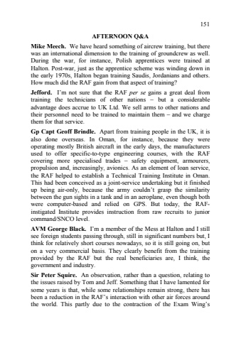 151%u0004%u0008%u0001%u0010%u0010%u0006A:%u0004%u0006ffi%u0015<%u0017%u0006ffi%u0017%u0017&*?%u0006%u0006We have heard something of aircrew training, but there was an international dimension to the training of groundcrew as well. During the war, for instance, Polish apprentices were trained at Halton. Post8war, just as the apprentice scheme was winding down in the early 1970s, Halton began training Saudis, Jordanians and others. How much did the RAF gain from that aspect of training? %u000e%u001799%u0013%-? I%u2019m not sure that the RAF per se gains a great deal from training the technicians of other nations %u2013 but a considerable advantage does accrue to UK Ltd. We sell arms to other nations and their personnel need to be trained to maintain them %u2013 and we charge them for that service. 3B%u0006%u0009(B%u0016%u00063%u0017%u001399%u0006%u0019%%u0015/-+%u0017? Apart from training people in the UK, it is also done overseas. In Oman, for instance, because they were operating mostly British aircraft in the early days, the manufacturers used to offer specific8to8type engineering courses, with the RAF covering more specialised trades %u2013 safety equipment, armourers, propulsion and, increasingly, avionics. As an element of loan service, the RAF helped to establish a Technical Training Institute in Oman. This had been conceived as a joint8service undertaking but it finished up being air8only, because the army couldn%u2019t grasp the similarity between the gun sights in a tank and in an aeroplane, even though both were computer8based and relied on GPS. But today, the RAF8instigated Institute provides instruction from raw recruits to junior command/SNCO level. %u0004%u001affi%u00063%u0017%u0013%,%u0017%u0006%u0019+(& I%u2019m a member of the Mess at Halton and I still see foreign students passing through, still in significant numbers but, I think for relatively short courses nowadays, so it is still going on, but on a very commercial basis. They clearly benefit from the training provided by the RAF but the real beneficiaries are, I think, the government and industry. %u000c%u0015%%u0006fi%u0017%u0016%u0017%%u0006%u000c@4%u0015%%u0017? An observation, rather than a question, relating to the issues raised by Tom and Jeff. Something that I have lamented for some years is that, while some relationships remain strong, there has been a reduction in the RAF%u2019s interaction with other air forces around the world. This partly due to the contraction of the Exam Wing%u2019s