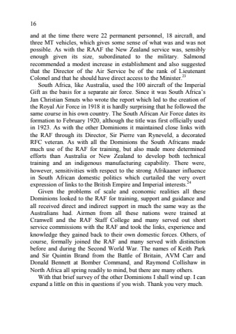 16and at the time there were 22 permanent personnel, 18 aircraft, and three MT vehicles, which gives some sense of what was and was not possible. As with the RAAF the New Zealand service was, sensibly enough given its size, subordinated to the military. Salmond recommended a modest increase in establishment and also suggested that the Director of the Air Service be of the rank of Lieutenant Colonel and that he should have direct access to the Minister.23 South Africa, like Australia, used the 100 aircraft of the Imperial Gift as the basis for a separate air force. Since it was South Africa%u2019s Jan Christian Smuts who wrote the report which led to the creation of the Royal Air Force in 1918 it is hardly surprising that he followed the same course in his own country. The South African Air Force dates its formation to February 1920, although the title was first officially used in 1923. As with the other Dominions it maintained close links with the RAF through its Director, Sir Pierre van Ryneveld, a decorated RFC veteran. As with all the Dominions the South Africans made much use of the RAF for training, but also made more determined efforts than Australia or New Zealand to develop both technical training and an indigenous manufacturing capability. There were, however, sensitivities with respect to the strong Afrikaaner influence in South African domestic politics which curtailed the very overt expression of links to the British Empire and Imperial interests.24 Given the problems of scale and economic realities all these Dominions looked to the RAF for training, support and guidance and all received direct and indirect support in much the same way as the Australians had. Airmen from all these nations were trained at Cranwell and the RAF Staff College and many served out short service commissions with the RAF and took the links, experience and knowledge they gained back to their own domestic forces. Others, of course, formally joined the RAF and many served with distinction before and during the Second World War. The names of Keith Park and Sir Quintin Brand from the Battle of Britain, AVM Carr and Donald Bennett at Bomber Command, and Raymond Collishaw in North Africa all spring readily to mind, but there are many others. With that brief survey of the other Dominions I shall wind up. I can expand a little on this in questions if you wish. Thank you very much.