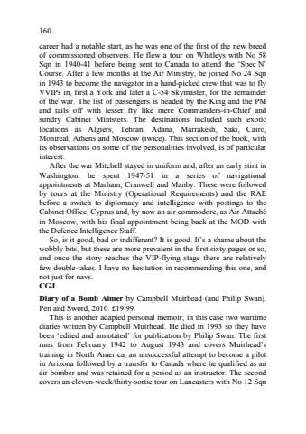 160career had a notable start, as he was one of the first of the new breed of commissioned observers. He flew a tour on Whitleys with No 58 Sqn in 1940841 before being sent to Canada to attend the %u2018Spec N%u2019 Course. After a few months at the Air Ministry, he joined No 24 Sqn in 1943 to become the navigator in a hand8picked crew that was to fly VVIPs in, first a York and later a C854 Skymaster, for the remainder of the war. The list of passengers is headed by the King and the PM and tails off with lesser fry like mere Commanders8in8Chief and sundry Cabinet Ministers. The destinations included such exotic locations as Algiers, Tehran, Adana, Marrakesh, Saki, Cairo, Montreal, Athens and Moscow (twice). This section of the book, with its observations on some of the personalities involved, is of particular interest. After the war Mitchell stayed in uniform and, after an early stint in Washington, he spent 1947851 in a series of navigational appointments at Marham, Cranwell and Manby. These were followed by tours at the Ministry (Operational Requirements) and the RAE before a switch to diplomacy and intelligence with postings to the Cabinet Office, Cyprus and, by now an air commodore, as Air Attach%u00e9 in Moscow, with his final appointment being back at the MOD with the Defence Intelligence Staff. So, is it good, bad or indifferent? It is good. It%u2019s a shame about the wobbly bits, but these are more prevalent in the first sixty pages or so, and once the story reaches the VIP8flying stage there are relatively few double8takes. I have no hesitation in recommending this one, and not just for navs. %u00093%u000e%u0006%u0018%u0015(%8%u0006%u00139%u0006(%u0006%u0019%u0013%u00140%u0006%u0004%u0015%u0014%u0017% by Campbell Muirhead (and Philip Swan). Pen and Sword, 2010. %u00a319.99. This is another adapted personal memoir; in this case two wartime diaries written by Campbell Muirhead. He died in 1993 so they have been %u2018edited and annotated%u2019 for publication by Philip Swan. The first runs from February 1942 to August 1943 and covers Muirhead%u2019s training in North America, an unsuccessful attempt to become a pilot in Arizona followed by a transfer to Canada where he qualified as an air bomber and was retained for a period as an instructor. The second covers an eleven8week/thirty8sortie tour on Lancasters with No 12 Sqn