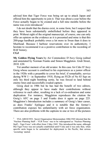 163advised him that Tiger Force was being set up to attack Japan and offered him the opportunity to join it. That was about a year before the Force actually began to be created and a full nine months before the name was even introduced.2 I do not doubt that the diaries exist, in some form, but I suspect that they have been substantially embellished before they appeared in print. Without sight of the original manuscript, of course, one can only offer an opinion on the evidence as it is presented and mine is that this 2008page hardback probably owes a lot more to Swan than it does to Muirhead. Because I harbour reservations over its authenticity, I hesitate to recommend it as a positive contribution to the recording of RAF history. %u00093%u000e%u0006ffi8%u00063%u0013+-%u0017/%u0006%u0008+8%u0015/,%u0006%u0003%u0017(%) by Air Commodore D%u2019Arcy Greig (edited and annotated by Norman Franks and Simon Muggleton. Grub Street, 2010. %u00a320. Yet another memoir of an old aviator. In this case Air Cdre D%u2019Arcy Greig whose account is confined to his experiences as a junior officer in the 1920s with a preamble to cover his brief, if remarkable, service during WW I %u2013 in September 1918, flying an FE2b of No 83 Sqn on only his third night bombing sortie, he was forced to land behind enemy lines and successfully evaded capture. Greig died in 1986 but he has had the benefit of two editors, although they appear to have made their contributions without reference to each other, resulting in a lack of co8ordination and some duplication. For instance, Muggleton reproduces the citation for Greig%u2019s AFC on page 5 and Franks does it again on page 225. Muggleton%u2019s Introduction includes a summary of Greig%u2019s later career, as does Franks%u2019 Epilogue and it is notable that the former%u2019s contribution exposes his unfamiliarity with air force organisation. There are also problems with the captions to one or two of the pictures 2 TNA AIR10/3931. Secret Organisation Memorandum 1086/1945 directed that the %u2018Nucleus Planning Staff %u2013 VLR Force%u2019 was to be redesignated as %u2018Nucleus Planning Staff %u2013 Tiger Force%u2019 with effect from 3 May 1945. This introduced the name, although HQ Tiger Force was not actually established until 9 July and it was only then, when specific units began to be earmarked for deployment to the Pacific, that serious %u2018recruiting%u2019 started.