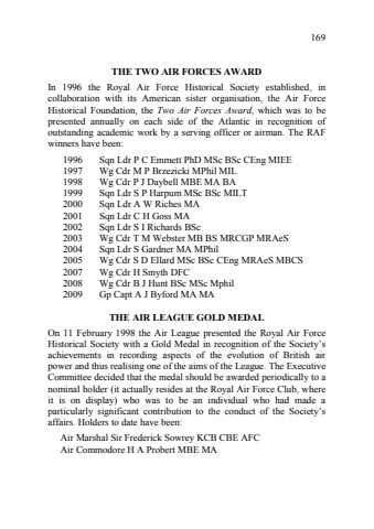 169%u000b%u0006#%u0006%u0004%u0007%u0001%u0006%u0008%u0001%u0009%u000c%u0006%u0004#%u0004%u0001%u0018%u0006In 1996 the Royal Air Force Historical Society established, in collaboration with its American sister organisation, the Air Force Historical Foundation, the Two Air Forces Award, which was to be presented annually on each side of the Atlantic in recognition of outstanding academic work by a serving officer or airman. The RAF winners have been: 1996 Sqn Ldr P C Emmett PhD MSc BSc CEng MIEE 1997 Wg Cdr M P Brzezicki MPhil MIL 1998 Wg Cdr P J Daybell MBE MA BA 1999 Sqn Ldr S P Harpum MSc BSc MILT 2000 Sqn Ldr A W Riches MA 2001 Sqn Ldr C H Goss MA 2002 Sqn Ldr S I Richards BSc 2003 Wg Cdr T M Webster MB BS MRCGP MRAeS 2004 Sqn Ldr S Gardner MA MPhil 2005 Wg Cdr S D Ellard MSc BSc CEng MRAeS MBCS 2007 Wg Cdr H Smyth DFC 2008 Wg Cdr B J Hunt BSc MSc Mphil 2009 Gp Capt A J Byford MA MA %u000b%u0006%u0004%u0007%u0001%u0006%u0005%u00043%u000f%u00063%u0005%u0018%u0006ffi%u0018%u0004%u0005%u0006On 11 February 1998 the Air League presented the Royal Air Force Historical Society with a Gold Medal in recognition of the Society%u2019s achievements in recording aspects of the evolution of British air power and thus realising one of the aims of the League. The Executive Committee decided that the medal should be awarded periodically to a nominal holder (it actually resides at the Royal Air Force Club, where it is on display) who was to be an individual who had made a particularly significant contribution to the conduct of the Society%u2019s affairs. Holders to date have been: Air Marshal Sir Frederick Sowrey KCB CBE AFC Air Commodore H A Probert MBE MA