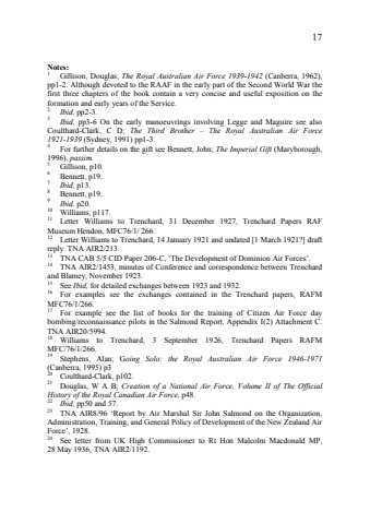 17%u0010%u0013%u0016%u0017)2%u00061 Gillison, Douglas; The Royal Australian Air Force 1939?1942 (Canberra, 1962), pp182. Although devoted to the RAAF in the early part of the Second World War the first three chapters of the book contain a very concise and useful exposition on the formation and early years of the Service. 2 Ibid, pp283. 3 Ibid, pp386 On the early manoeuvrings involving Legge and Maguire see also Coulthard8Clark, C D; The Third Brother %u2013 The Royal Australian Air Force 1921?1939 (Sydney, 1991) pp183. 4 For further details on the gift see Bennett, John; The Imperial Gift (Maryborough, 1996), passim.5 Gillison, p10. 6 Bennett, p19. 7 Ibid, p13. 8 Bennett, p19. 9 Ibid, p20. 10 Williams, p117. 11 Letter Williams to Trenchard, 31 December 1927, Trenchard Papers RAF Museum Hendon, MFC76/1/ 266. 12 Letter Williams to Trenchard, 14 January 1921 and undated [1 March 1921?] draft reply. TNA AIR2/213. 13 TNA CAB 5/5 CID Paper 2068C, %u2018The Development of Dominion Air Forces%u2019. 14 TNA AIR2/1453, minutes of Conference and correspondence between Trenchard and Blamey, November 1923. 15 See Ibid, for detailed exchanges between 1923 and 1932. 16 For examples see the exchanges contained in the Trenchard papers, RAFM MFC76/1/266. 17 For example see the list of books for the training of Citizen Air Force day bombing/reconnaissance pilots in the Salmond Report, Appendix I(2) Attachment C. TNA AIR20/5994. 18 Williams to Trenchard, 3 September 1926, Trenchard Papers RAFM MFC/76/1/266. 19 Stephens, Alan; Going Solo: the Royal Australian Air Force 1946?1971(Canberra, 1995) p3 20 Coulthard8Clark, p102. 21 Douglas, W A B; Creation of a National Air Force, Volume II of The Official History of the Royal Canadian Air Force, p48. 22 Ibid, pp50 and 57. 23 TNA AIR8/96 %u2018Report by Air Marshal Sir John Salmond on the Organization, Administration, Training, and General Policy of Development of the New Zealand Air Force%u2019, 1928. 24 See letter from UK High Commissioner to Rt Hon Malcolm Macdonald MP, 28 May 1936, TNA AIR2/1192.