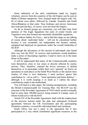 19 Some indication of the early contribution made by, largely volunteer, aircrew from the countries of the old Empire can be seen in Battle of Britain manpower. New Zealand made the largest with 126, 94 of whom were pilots, followed by Canada, Australia and South Africa/Rhodesia in that order. Nine Irishmen and eleven Americans also took part but they, of course, were not from the Empire. As far as formed groups are concerned, you will later hear brief mention of The Eagle Squadrons but units of exiled Greeks and Yugoslavs were also formed into nationally identifiable squadrons. The embryo Indian Air Force %u2013 and at that this stage we are talking of course about %u2018undivided India%u2019 %u2013 will not be considered further because it was essentially not independent but formed, trained, equipped and deployed on operations under the overall leadership of the RAF. Although the adventures of the myriad of individuals who found their way into the RAF, its reserves and auxiliaries would doubtless make a series of fascinating vignettes, I need to move on to the main thrust of this paper. It will be appreciated that many of the Commonwealth countries were themselves close to war zones or directly affected by enemy activity. They, therefore, retained the forces necessary to defend themselves or to participate within their own %u2018national%u2019 air forces on operations in such places as the South West Pacific or the eastern most reaches of what is now Indonesia. I must perforce ignore that contribution to %u2013 let us call it %u2013 %u2018local operations and home defence%u2019 %u2013 although it is worth keeping it in mind as I outline the direct contributions made to the motherland. You will find in a later paper, the training arrangements, including the British Commonwealth Air Training Plan. The BCATP was the outcome of the Riverdale Agreement of 1939 which would eventually lead to more than 100,000 aircrew being trained in Canada, most of whom would serve with the RAF. Article XV of the Riverdale Agreement, dealt with the employment of the aircrews trained under the plan and subsequent bi8lateral agreements between the UK Government and the participating Dominion countries, covered the individual detail and variations. South Africa was not a party to the agreement but it also participated in a way which contributed significant resources to the