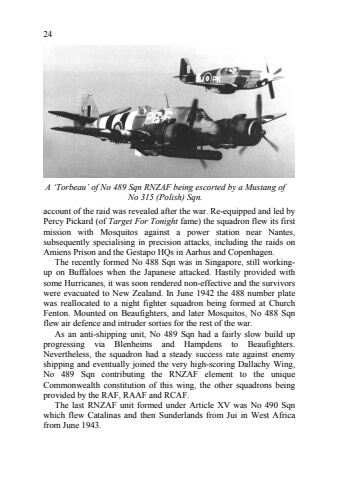 24account of the raid was revealed after the war. Re8equipped and led by Percy Pickard (of Target For Tonight fame) the squadron flew its first mission with Mosquitos against a power station near Nantes, subsequently specialising in precision attacks, including the raids on Amiens Prison and the Gestapo HQs in Aarhus and Copenhagen. The recently formed No 488 Sqn was in Singapore, still working8up on Buffaloes when the Japanese attacked. Hastily provided with some Hurricanes, it was soon rendered non8effective and the survivors were evacuated to New Zealand. In June 1942 the 488 number plate was reallocated to a night fighter squadron being formed at Church Fenton. Mounted on Beaufighters, and later Mosquitos, No 488 Sqn flew air defence and intruder sorties for the rest of the war. As an anti8shipping unit, No 489 Sqn had a fairly slow build up progressing via Blenheims and Hampdens to Beaufighters. Nevertheless, the squadron had a steady success rate against enemy shipping and eventually joined the very high8scoring Dallachy Wing, No 489 Sqn contributing the RNZAF element to the unique Commonwealth constitution of this wing, the other squadrons being provided by the RAF, RAAF and RCAF. The last RNZAF unit formed under Article XV was No 490 Sqn which flew Catalinas and then Sunderlands from Jui in West Africa from June 1943. A %u2018Torbeau%u2019 of No 489 Sqn RNZAF being escorted by a Mustang of No 315 (Polish) Sqn.