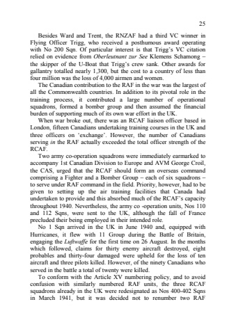 25 Besides Ward and Trent, the RNZAF had a third VC winner in Flying Officer Trigg, who received a posthumous award operating with No 200 Sqn. Of particular interest is that Trigg%u2019s VC citation relied on evidence from Oberleutnant zur See Klemens Schamong %u2013 the skipper of the U8Boat that Trigg%u2019s crew sank. Other awards for gallantry totalled nearly 1,300, but the cost to a country of less than four million was the loss of 4,000 airmen and women. The Canadian contribution to the RAF in the war was the largest of all the Commonwealth countries. In addition to its pivotal role in the training process, it contributed a large number of operational squadrons, formed a bomber group and then assumed the financial burden of supporting much of its own war effort in the UK. When war broke out, there was an RCAF liaison officer based in London, fifteen Canadians undertaking training courses in the UK and three officers on %u2018exchange%u2019. However, the number of Canadians serving in the RAF actually exceeded the total officer strength of the RCAF. Two army co8operation squadrons were immediately earmarked to accompany 1st Canadian Division to Europe and AVM George Croil, the CAS, urged that the RCAF should form an overseas command comprising a Fighter and a Bomber Group %u2013 each of six squadrons %u2013 to serve under RAF command in the field. Priority, however, had to be given to setting up the air training facilities that Canada had undertaken to provide and this absorbed much of the RCAF%u2019s capacity throughout 1940. Nevertheless, the army co 8operation units, Nos 110 and 112 Sqns, were sent to the UK, although the fall of France precluded their being employed in their intended role. No 1 Sqn arrived in the UK in June 1940 and, equipped with Hurricanes, it flew with 11 Group during the Battle of Britain, engaging the Luftwaffe for the first time on 26 August. In the months which followed, claims for thirty enemy aircraft destroyed, eight probables and thirty8four damaged were upheld for the loss of ten aircraft and three pilots killed. However, of the ninety Canadians who served in the battle a total of twenty were killed. To conform with the Article XV numbering policy, and to avoid confusion with similarly numbered RAF units, the three RCAF squadrons already in the UK were redesignated as Nos 4008402 Sqns in March 1941, but it was decided not to renumber two RAF