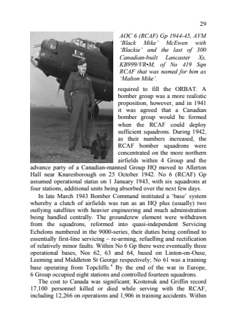 29required to fill the ORBAT. A bomber group was a more realistic proposition, however, and in 1941 it was agreed that a Canadian bomber group would be formed when the RCAF could deploy sufficient squadrons. During 1942, as their numbers increased, the RCAF bomber squadrons were concentrated on the more northern airfields within 4 Group and the advance party of a Canadian8manned Group HQ moved to Allerton Hall near Knaresborough on 25 October 1942. No 6 (RCAF) Gp assumed operational status on 1 January 1943, with six squadrons at four stations, additional units being absorbed over the next few days. In late March 1943 Bomber Command instituted a %u2018base%u2019 system whereby a clutch of airfields was run as an HQ plus (usually) two outlying satellites with heavier engineering and much administration being handled centrally. The groundcrew element were withdrawn from the squadrons, reformed into quasi8independent Servicing Echelons numbered in the 90008series, their duties being confined to essentially first8line servicing %u2013 re8arming, refuelling and rectification of relatively minor faults. Within No 6 Gp there were eventually three operational bases, Nos 62, 63 and 64, based on Linton8on8Ouse, Leeming and Middleton St George respectively; No 61 was a training base operating from Topcliffe.4 By the end of the war in Europe, 6 Group occupied eight stations and controlled fourteen squadrons. The cost to Canada was significant; Kostenuk and Griffin record 17,100 personnel killed or died while serving with the RCAF, including 12,266 on operations and 1,906 in training accidents. Within AOC 6 (RCAF) Gp 1944?45, AVM %u2018Black Mike%u2019 McEwen with %u2018Blackie%u2019 and the last of 300 Canadian?built Lancaster Xs, KB999/VR%u2022M, of No 419 Sqn RCAF that was named for him as %u2018Malton Mike%u2019.