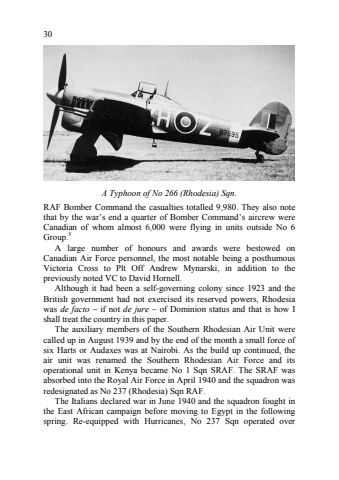 30RAF Bomber Command the casualties totalled 9,980. They also note that by the war%u2019s end a quarter of Bomber Command%u2019s aircrew were Canadian of whom almost 6,000 were flying in units outside No 6 Group.5 A large number of honours and awards were bestowed on Canadian Air Force personnel, the most notable being a posthumous Victoria Cross to Plt Off Andrew Mynarski, in addition to the previously noted VC to David Hornell. Although it had been a self8governing colony since 1923 and the British government had not exercised its reserved powers, Rhodesia was de facto %u2013 if not de jure %u2013 of Dominion status and that is how I shall treat the country in this paper. The auxiliary members of the Southern Rhodesian Air Unit were called up in August 1939 and by the end of the month a small force of six Harts or Audaxes was at Nairobi. As the build up continued, the air unit was renamed the Southern Rhodesian Air Force and its operational unit in Kenya became No 1 Sqn SRAF. The SRAF was absorbed into the Royal Air Force in April 1940 and the squadron was redesignated as No 237 (Rhodesia) Sqn RAF. The Italians declared war in June 1940 and the squadron fought in the East African campaign before moving to Egypt in the following spring. Re8equipped with Hurricanes, No 237 Sqn operated over A Typhoon of No 266 (Rhodesia) Sqn.