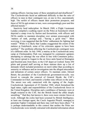 38ranking officers; leaving many of these unemployed and disaffected.11The Czechoslovaks faced an additional difficulty in that the ratio of officers to men in their contingent was, at one to five, uncommonly high. The surfeit of officers meant their promotion prospects, and those of NCOs and airmen in turn, were correspondingly poor and this affected morale.12 Inactivity bred indiscipline. In March 1940, a Flight Lieutenant Landau compiled a scathing report on the Poles at Eastchurch which depicted a camp riven by faction and favouritism, with officers and NCOs unable to maintain discipline over airmen preoccupied with %u2018matters of rank, prestige and%u2026%u2018%u201dhaving a good time.%u201d%u2019 Most worrying, it was suggested that the Poles%u2019 enthusiasm for fighting had waned.13 While it is likely that Landau exaggerated the extent of the malaise at Eastchurch, some of his criticisms appear to have been justified.14 The problems affecting the Czechoslovak contingent were of a different order. In July 1940, a mutiny at the Czechoslovak army camp at Cholmondeley Park was instigated by communist agitators attempting to sabotage the war effort in line with Comintern policy. The unrest spread in August to the air force units based at Honington and Duxford and, from there, to the CAF depot at Cosford. Some 450 pilots and ground staff serving at these stations drew up a list of demands which included promotion on merit rather than according to seniority or influence and an investigation into the alleged misconduct and defeatism of certain senior officers. To maintain order, Edvard Bene%u0161, the president of the Czechoslovak government8in8exile, was forced to concede the removal of General Slez%u00e1k, the CAF%u2019s Commander8in8Chief, and transfer a further nine officers to the army. The unrest was only cauterised with the signing of the Anglo8Czechoslovak Agreement of 25 October 1940, which formalised the legal status, rights and responsibilities of the Czechoslovak forces in the United Kingdom. Discipline and a semblance of harmony were at length restored to the CAF, but the British found the affair deeply unsettling.15 Had they but known it, there were more sinister forces at work. Although the exiles had been screened by British Intelligence, at least one Gestapo agent, the Czech Augustin P%u0159eu%u010dil, managed to penetrate Fighter Command and there may well have been others.16 It is perhaps understandable in this context that neither the Poles nor Czechoslovaks were initially entrusted with detailed information about