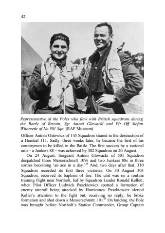 42Officer Antoni Ostowicz of 145 Squadron shared in the destruction of a Heinkel 111. Sadly, three weeks later, he became the first of his countrymen to be killed in the Battle. The first success by a national unit %u2013 a Junkers 88 %u2013 was achieved by 302 Squadron on 20 August. On 24 August, Sergeant Antoni Glowacki of 501 Squadron despatched three Messerschmitt 109s and two Junkers 88s in three sorties becoming %u2018an ace in a day.%u201928 And, two days after that, 310 Squadron recorded its first three victories. On 30 August 303 Squadron, received its baptism of fire. The unit was on a routine training flight near Northolt, led by Squadron Leader Ronald Kellett, when Pilot Officer Ludwick Paszkiewicz spotted a formation of enemy aircraft being attacked by Hurricanes. Paszkiewicz alerted Kellet%u2019s attention to the fight but, receiving no reply; he broke formation and shot down a Messerschmitt 110.29 On landing, the Pole was brought before Northolt%u2019s Station Commander, Group Captain Representative of the Poles who flew with British squadrons during the Battle of Britain, Sgt Antoni Glowacki and Plt Off StefanWitorze%u0144c of No 501 Sqn. (RAF Museum)