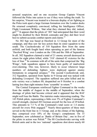 44aroused suspicion, and on one occasion Group Captain Vincent followed the Poles into action to see if they were telling the truth. To his surprise, Vincent was treated to a bravura display of air fighting as the Poles took apart a large German formation over the London docks He returned completely convinced, telling his Intelligence Officer, Flight Lieutenant Wilkins, %u2018that what they claimed they did, indeed, get!%u201932 It appears that the pilots of %u2018303%u2019 had anticipated that their word might be doubted by their British comrades and they did their level best to submit accurate combat reports and claims.33 No 302 Sqn was based at Duxford in 12 Group for most of the campaign, and thus saw far less action than its sister squadron to the south. The Czechoslovaks of 310 Squadron flew from the same airfield, and both fought hard when operating as part of the famous %u2018Duxford Wing%u2019 over London on the 15th and the 18th of September. In all, 302 Squadron claimed a total of 21 enemy aircraft destroyed in return for eight pilots killed, while %u2018310%u2019 claimed 42 victories for the loss of four.34 In common with all of the units that comprised the %u2018Big Wings%u2019, both squadrons appear to have been guilty of inadvertent over8claiming. This was, however, likely to occur whenever large numbers of defending fighters were deployed against enemy formations in congested airspace.35 The second Czechoslovak unit, 312 Squadron, operated from Speke in 9 Group and was tasked with defending Liverpool. The squadron suffered one pilot killed and its sole victory was a Junkers 88, despatched on 8 October in a combat lasting less than eight minutes from %u2018scramble%u2019 to return.36 The Central Europeans reinforced Fighter Command in the weeks from the middle of August to the middle of September, when the shortage of pilots had become critical and it appeared that the RAF might well lose the Battle. The statistics make interesting reading. The 145 Polish pilots, representing a little over 5% of Fighter Command%u2019s overall strength, claimed 203 German aircraft for the loss of 29 killed. This amounts to 7.5 % of the Command%u2019s total score or 1.4 enemy aircraft for every Pole engaged.37 Nearly three8quarters of these men served in the front line in 11 Group, and, at the climax of the fighting, they comprised over 10% of the Group%u2019s complement. On 15 September, now celebrated as %u2018Battle of Britain Day%u2019, one in five of the pilots in action was Polish.38 The 88 Czechoslovaks serving with British units and in the two %u2018national%u2019 squadrons shot down nearly 60