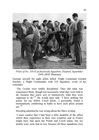 45German aircraft for eight pilots killed. Flight Lieutenant Gordon Sinclair, a Flight Commander with 310 Squadron, wrote of his comrades: %u2018The Czechs were totally disciplined. They did what was expected of them, though not necessarily what they were told to do, because they knew sort of instinctively what they were supposed to do.%u201939 He would later add: %u2018I have nothing but praise for my fellow Czech pilots%u2026I personally found it tremendously comforting in battle to have such pilots around me.%u201940 Dowding admitted he was wrong about the Slavs writing: %u2018I must confess that I had been a little doubtful of the effect which their experience in their own countries and in France might have had upon the Polish and Czech pilots, but my doubts were soon laid to rest, because all three squadrons (two Pilots of No. 310 (Czechoslovak) Squadron, Duxford, September 1940. (RAF Museum)