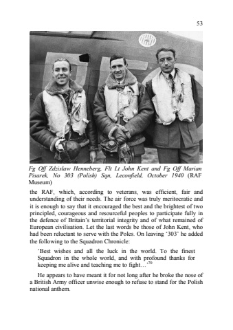 53the RAF, which, according to veterans, was efficient, fair and understanding of their needs. The air force was truly meritocratic and it is enough to say that it encouraged the best and the brightest of two principled, courageous and resourceful peoples to participate fully in the defence of Britain%u2019s territorial integrity and of what remained of European civilisation. Let the last words be those of John Kent, who had been reluctant to serve with the Poles. On leaving %u2018303%u2019 he added the following to the Squadron Chronicle: %u2018Best wishes and all the luck in the world. To the finest Squadron in the whole world, and with profound thanks for keeping me alive and teaching me to fight%u2026%u201970 He appears to have meant it for not long after he broke the nose of a British Army officer unwise enough to refuse to stand for the Polish national anthem. Fg Off Zdzislaw Henneberg, Flt Lt John Kent and Fg Off Marian Pisarek, No 303 (Polish) Sqn, Leconfield, October 1940 (RAF Museum)