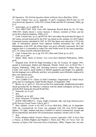 56303 Squadron: 303 (Polish) Squadron Battle of Britain Diary (Red Kite, 2010). 34 Cnyk, Volume Two, op cit, Appendix 15, p633; Listemann, Phil H (ed); No 310 (Czechoslovak) Squadron, 1940?1945 (Tomas Polak and Phil H Listemann, 2006), pp 8815. 35 Gretzyngier, op cit, pp89890, 105. 36 TNA AIR27/1691: RAF Form 540, Operations Record Book for No 312 Sqn, 194081941; Smith, David J; Action Stations 3: Military Airfields of Wales and the North?West (Patrick Stephens, 1990), p173. 37 Cynk, Volume One, op cit, pp1928194. Mr Cynk makes the point that the figure of 203 enemy aircraft destroyed by the PAF was based on the estimate of 2,692 Fighter Command victories calculated in 1942. In 1947 this figure was reduced to 1,733 in the light of information gleaned from captured German documents but, with the disbandment of the PAF, the Polish figure was never officially reassessed. Mr Cynk suggests that it is reasonable to reduce the total Polish score by the same proportion, ie to 131 enemy aircraft confirmed destroyed. 38 Cynk, Volume One, op cit, pp 1928195; Olson and Cloud, op cit, p151. 39 Gelb, op cit, p49. 40 Sarkar, Dilip; Battle of Britain: Last Look Back (Ramrod Publications, 2002), p149. 41 Despatch from ACM Sir Hugh Dowding to the Air Council, 20 August 1941, quoted in Gretzyngier, Robert and Matusiak, Wojtek; Polish Aces of World War 2(Osprey Publishing, 1998), p26. Dowding however concluded: %u2018Other Poles and Czechs were used in small numbers in British squadrons and fought very gallantly, but the language was a difficulty and they were probably most efficiently employed in their own national units.%u2019 42 Zamoyski, op cit, p97. 43 TNA CAB66/12/14: Chiefs of Staff Committee: Organisation of Allied Naval, Army and Air Contingents, Ninth Weekly Report, 25 September 1940. 44 Brown, op cit, pp12813. This sets out the five (surprisingly enlightened) principles which governed the Air Ministry%u2019s relations with the allied contingents serving in or with the RAF during the Second World War. 45 Zamoyski, op cit, p12. 46 Ibid. 47 Zumbach, op cit, p42. 48 Daily Telegraph, 25 October 1940. 49 RAFM X00386084/151: Vrana, Flight Lieutenant Ada; Life?long Reminiscences of My Dearest Friend Tom%u00e1s Vybiral, pp182. 50 Hurt, Zden%u011bk; Czechs in the RAF in Focus (Red Kite, 2004), p6. In September 1938, the Czechoslovak Air Force was equipped with 326 Avia B.534 biplane fighters, 155 light, medium and heavy bombers of mixed Czechoslovak, French and Soviet manufacture and about 320 reconnaissance machines, mostly Letov %u0160.328s. 51 Ibid. 52 Pezke, Michael Alfred; Poland%u2019s Miitary Aviation, September 1939: It Never Had a Chance, in Robin Higham and Stephen J. Harris (ed.) Why Air Forces Fail: the Anatomy of Defeat (The University Press of Kentucky, 2006), Chapter One. See also