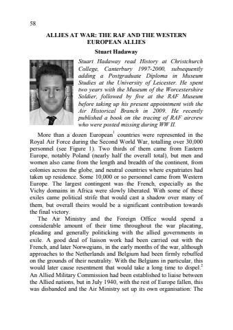 58%u0004%u0005%u0005%u0007%u000c%u0006%u0004%u0006#%u0004%u00012%u0006%u000b%u0006%u0001%u0004%u0008%u0006%u0004%u0010%u0018%u0006%u000b%u0006#%u000c%u0001%u0010%u0006%u000f%u0001fi%u0004%u0010%u0006%u0004%u0005%u0005%u0007%u000c%u0006%u000c%u00164(%%u0016%u0006%u000b(-(.(8%u0006Stuart Hadaway read History at Christchurch College, Canterbury 1997?2000, subsequently adding a Postgraduate Diploma in Museum Studies at the University of Leicester. He spent two years with the Museum of the Worcestershire Soldier, followed by five at the RAF Museum before taking up his present appointment with the Air Historical Branch in 2009. He recently published a book on the tracing of RAF aircrew who were posted missing during WW II. More than a dozen European1 countries were represented in the Royal Air Force during the Second World War, totalling over 30,000 personnel (see Figure 1). Two thirds of them came from Eastern Europe, notably Poland (nearly half the overall total), but men and women also came from the length and breadth of the continent, from colonies across the globe, and neutral countries where expatriates had taken up residence. Some 10,000 or so personnel came from Western Europe. The largest contingent was the French, especially as the Vichy domains in Africa were slowly liberated. With some of these exiles came political strife that would cast a shadow over many of them, but overall theirs would be a significant contribution towards the final victory. The Air Ministry and the Foreign Office would spend a considerable amount of their time throughout the war placating, pleading and generally politicking with the allied governments in exile. A good deal of liaison work had been carried out with the French, and later Norwegians, in the early months of the war, although approaches to the Netherlands and Belgium had been firmly rebuffed on the grounds of their neutrality. With the Belgians in particular, this would later cause resentment that would take a long time to dispel.2An Allied Military Commission had been established to liaise between the Allied nations, but in July 1940, with the rest of Europe fallen, this was disbanded and the Air Ministry set up its own organisation: The
