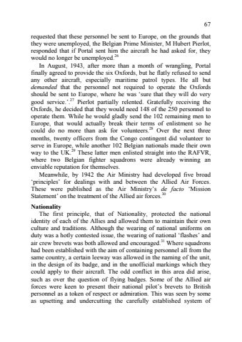 67requested that these personnel be sent to Europe, on the grounds that they were unemployed, the Belgian Prime Minister, M Hubert Pierlot, responded that if Portal sent him the aircraft he had asked for, they would no longer be unemployed.26 In August, 1943, after more than a month of wrangling, Portal finally agreed to provide the six Oxfords, but he flatly refused to send any other aircraft, especially maritime patrol types. He all but demanded that the personnel not required to operate the Oxfords should be sent to Europe, where he was %u2018sure that they will do very good service.%u2019.27 Pierlot partially relented. Gratefully receiving the Oxfords, he decided that they would need 148 of the 250 personnel to operate them. While he would gladly send the 102 remaining men to Europe, that would actually break their terms of enlistment so he could do no more than ask for volunteers.28 Over the next three months, twenty officers from the Congo contingent did volunteer to serve in Europe, while another 102 Belgian nationals made their own way to the UK.29 These latter men enlisted straight into the RAFVR,where two Belgian fighter squadrons were already winning an enviable reputation for themselves. Meanwhile, by 1942 the Air Ministry had developed five broad %u2018principles%u2019 for dealings with and between the Allied Air Forces. These were published as the Air Ministry%u2019s de facto %u2018Mission Statement%u2019 on the treatment of the Allied air forces.30%u0010(%u0016%u0015%u0013/(+%u0015%u00168%u0006 The first principle, that of Nationality, protected the national identity of each of the Allies and allowed them to maintain their own culture and traditions. Although the wearing of national uniforms on duty was a hotly contested issue, the wearing of national %u2018flashes%u2019 and air crew brevets was both allowed and encouraged.31 Where squadrons had been established with the aim of containing personnel all from the same country, a certain leeway was allowed in the naming of the unit, in the design of its badge, and in the unofficial markings which they could apply to their aircraft. The odd conflict in this area did arise, such as over the question of flying badges. Some of the Allied air forces were keen to present their national pilot%u2019s brevets to British personnel as a token of respect or admiration. This was seen by some as upsetting and undercutting the carefully established system of
