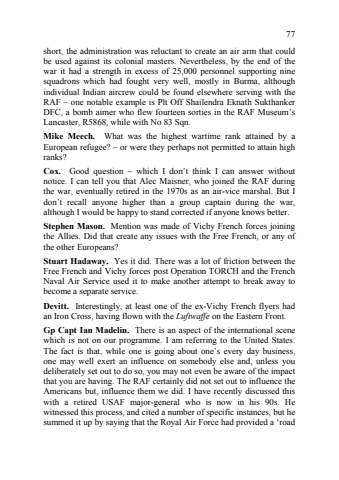 77short, the administration was reluctant to create an air arm that could be used against its colonial masters. Nevertheless, by the end of the war it had a strength in excess of 25,000 personnel supporting nine squadrons which had fought very well, mostly in Burma, although individual Indian aircrew could be found elsewhere serving with the RAF %u2013 one notable example is Plt Off Shailendra Eknath Sukthanker DFC, a bomb aimer who flew fourteen sorties in the RAF Museum%u2019s Lancaster, R5868, while with No 83 Sqn. ffi%u0015<%u0017%u0006 ffi%u0017%u0017&*? What was the highest wartime rank attained by a European refugee? %u2013 or were they perhaps not permitted to attain high ranks? %u0009%u00131? Good question %u2013 which I don%u2019t think I can answer without notice. I can tell you that Alec Maisner, who joined the RAF during the war, eventually retired in the 1970s as an air8vice marshal. But I don%u2019t recall anyone higher than a group captain during the war, although I would be happy to stand corrected if anyone knows better. %u000c%u0016%u0017B*%u0017/%u0006ffi()%u0013/? Mention was made of Vichy French forces joining the Allies. Did that create any issues with the Free French, or any of the other Europeans? %u000c%u00164(%%u0016%u0006%u000b(-(.(8? Yes it did. There was a lot of friction between the Free French and Vichy forces post Operation TORCH and the French Naval Air Service used it to make another attempt to break away to become a separate service. %u0018%u00177%u0015%u0016%u0016? Interestingly, at least one of the ex8Vichy French flyers had an Iron Cross, having flown with the Luftwaffe on the Eastern Front. 3B%u0006%u0009(B%u0016%u0006%u0007(/%u0006ffi(-%u0017+%u0015/? There is an aspect of the international scene which is not on our programme. I am referring to the United States. The fact is that, while one is going about one%u2019s every day business, one may well exert an influence on somebody else and, unless you deliberately set out to do so, you may not even be aware of the impact that you are having. The RAF certainly did not set out to influence the Americans but, influence them we did. I have recently discussed this with a retired USAF major8general who is now in his 90s. He witnessed this process, and cited a number of specific instances, but he summed it up by saying that the Royal Air Force had provided a %u2018road