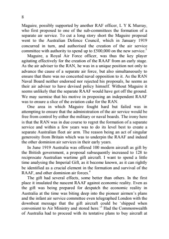 8Maguire, possibly supported by another RAF officer, L Y K Murray, who first proposed to one of the sub8committees the formation of a separate air service. To cut a long story short the Maguire proposal went to the Australian Defence Council, which in January 1919 concurred in turn, and authorised the creation of the air service committee with authority to spend up to %u00a3500,000 on the new service.3 Maguire, a Royal Air Force officer, was thus the key player agitating effectively for the creation of the RAAF from an early stage. As the air adviser to the RAN, he was in a unique position not only to advance the cause of a separate air force, but also simultaneously to ensure that there was no concerted naval opposition to it. As the RAN Naval Board neither endorsed nor rejected his proposals, he seems as their air adviser to have devised policy himself. Without Maguire it seems unlikely that the separate RAAF would have got off the ground. We may surmise that his motive in proposing an independent RAAF was to ensure a slice of the aviation cake for the RAN. One area in which Maguire fought hard but failed was in attempting to ensure that the administration of the air service would be free from control by either the military or naval boards. The irony here is that the RAN was in due course to regret the formation of a separate service and within a few years was to do its level best to create a separate Australian fleet air arm. The reason being an act of singular generosity from Britain which was to underpin the RAAF and indeed the other dominion air services in their early years. In June 1919 Australia was offered 100 modern aircraft as gift by the British government, a proposal subsequently increased to 128 to reciprocate Australian wartime gift aircraft. I want to spend a little time analysing the Imperial Gift, as it become known, as it can rightly be identified as a crucial element in the formation and survival of the RAAF, and other dominion air forces.4 The gift had several effects, some better than others. In the first place it insulated the nascent RAAF against economic reality. Even as the gift was being prepared for despatch the economic reality in Australia at the time was biting deep into the pioneer airmen%u2019s plans and the infant air service committee even telegraphed London with the downbeat message that the gift aircraft could be %u2018shipped when convenient to Air Ministry and stored here.%u20195 Had the Commonwealth of Australia had to proceed with its tentative plans to buy aircraft at