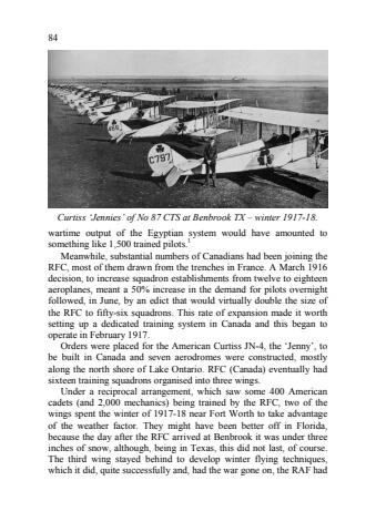 84wartime output of the Egyptian system would have amounted to something like 1,500 trained pilots.1 Meanwhile, substantial numbers of Canadians had been joining the RFC, most of them drawn from the trenches in France. A March 1916 decision, to increase squadron establishments from twelve to eighteen aeroplanes, meant a 50% increase in the demand for pilots overnight followed, in June, by an edict that would virtually double the size of the RFC to fifty8six squadrons. This rate of expansion made it worth setting up a dedicated training system in Canada and this began to operate in February 1917. Orders were placed for the American Curtiss JN84, the %u2018Jenny%u2019, to be built in Canada and seven aerodromes were constructed, mostly along the north shore of Lake Ontario. RFC (Canada) eventually had sixteen training squadrons organised into three wings. Under a reciprocal arrangement, which saw some 400 American cadets (and 2,000 mechanics) being trained by the RFC, two of the wings spent the winter of 1917818 near Fort Worth to take advantage of the weather factor. They might have been better off in Florida, because the day after the RFC arrived at Benbrook it was under three inches of snow, although, being in Texas, this did not last, of course. The third wing stayed behind to develop winter flying techniques, which it did, quite successfully and, had the war gone on, the RAF had Curtiss %u2018Jennies%u2019 of No 87 CTS at Benbrook TX %u2013 winter 1917?18.