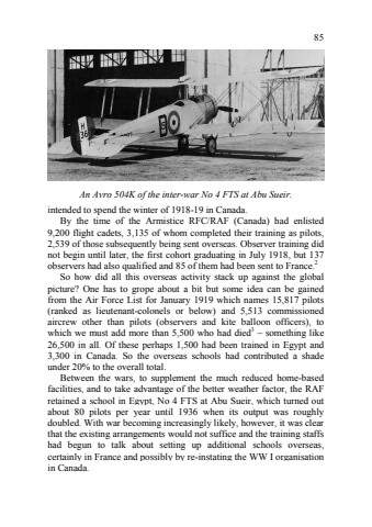 85intended to spend the winter of 1918819 in Canada. By the time of the Armistice RFC/RAF (Canada) had enlisted 9,200 flight cadets, 3,135 of whom completed their training as pilots, 2,539 of those subsequently being sent overseas. Observer training did not begin until later, the first cohort graduating in July 1918, but 137 observers had also qualified and 85 of them had been sent to France.2 So how did all this overseas activity stack up against the global picture? One has to grope about a bit but some idea can be gained from the Air Force List for January 1919 which names 15,817 pilots (ranked as lieutenant8colonels or below) and 5,513 commissioned aircrew other than pilots (observers and kite balloon officers), to which we must add more than 5,500 who had died3 %u2013 something like 26,500 in all. Of these perhaps 1,500 had been trained in Egypt and 3,300 in Canada. So the overseas schools had contributed a shade under 20% to the overall total. Between the wars, to supplement the much reduced home8based facilities, and to take advantage of the better weather factor, the RAF retained a school in Egypt, No 4 FTS at Abu Sueir, which turned out about 80 pilots per year until 1936 when its output was roughly doubled. With war becoming increasingly likely, however, it was clear that the existing arrangements would not suffice and the training staffs had begun to talk about setting up additional schools overseas, certainly in France and possibly by re8instating the WW I organisation in Canada. An Avro 504K of the inter?war No 4 FTS at Abu Sueir.