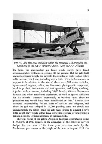 9the time, the independent air force would surely have faced insurmountable problems in getting off the ground. But the gift itself did not comprise simply the aircraft. It consisted in reality of an entire self8contained air force, including not a little of the infrastructure to support it. In addition to the aircraft there were 285 motor vehicles, spare aircraft engines, radios, machine tools, photographic equipment, workshop plant, instruments and test apparatus, and flying clothing, together with armament, including 3,000 bombs, thirteen Bessoneau hangars and other aerodrome equipment, as well as spares sufficient for six months%u2019 wastage, presumably at wartime rates, since no peacetime rate would have been established by then.6 London also accepted responsibility for the costs of packing and shipping, and since the gift was shipped in 19,000 packing cases we should not underestimate the latter.7 Had the gift been limited to aircraft I have little doubt they would either have gone into storage or undergone a rapid a possibly terminal decrease in serviceability. The total value of the gift to Australia has been estimated at some %u00a31,000,000 at 1920 prices8, or the equivalent of the entire air service budget for one year of the three year provision made by the Melbourne government at the height of the war in August 1918. On DH 9A, like this one, included within the Imperial Gift provided the backbone of the RAAF throughout the 1920s. (RAAF Official)