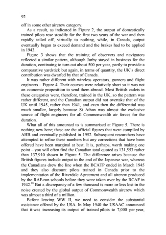 92off in some other aircrew category. As a result, as indicated in Figure 2, the output of domestically trained pilots rose steadily for the first two years of the war and then rapidly tailed off, virtually to nothing, while, in Canada, output eventually began to exceed demand and the brakes had to be applied in 1943. Figure 3 shows that the training of observers and navigatorsreflected a similar pattern, although Jurby stayed in business for the duration, continuing to turn out about 500 per year, partly to provide a comparative yardstick but again, in terms of quantity, the UK%u2019s direct contribution was dwarfed by that of Canada. It was rather different with wireless operators, gunners and flight engineers %u2013 Figure 4. Their courses were relatively short so it was not an economic proposition to send them abroad. Most British cadets in these categories were, therefore, trained in the UK, so the pattern was rather different, and the Canadian output did not overtake that of the UK until 1945, rather than 1941, and even then the differential was much smaller, largely because St Athan was almost the exclusive source of flight engineers for all Commonwealth air forces for the duration. What all of this amounted to is summarised at Figure 5. There is nothing new here; these are the official figures that were compiled by AHB and eventually published in 1952. Subsequent researchers have attempted to refine these numbers but any corrections that have been offered have been marginal at best. It is, perhaps, worth making one point %u2013 you will often find the Canadian total quoted as 131,553 rather than 137,910 shown in Figure 5. The difference arises because the British figures include output to the end of the Japanese war, whereas the Canadians drew the line when the BCATP ended in March 1945 and they also discount pilots trained in Canada prior to the implementation of the Riverdale Agreement and all aircrew produced by the RAF8run schools before they were taken over by the RCAF in 1942.18 But a discrepancy of a few thousand is more or less lost in the noise created by the global output of Commonwealth aircrew which was almost a third of a million. Before leaving WW II, we need to consider the substantial assistance offered by the USA. In May 1940 the USAAC announced that it was increasing its output of trained pilots to 7,000 per year,