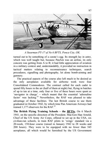 97turned out to be something of a curate%u2019s egg. Its strength lay in astro, which was well taught but, because PanAm was an airline, its only concern was getting from A to B; it had little appreciation of aviation in a military context and, understandably, it provided no instruction in tactical matters relating to reconnaissance techniques, search procedures, signalling and photography, let alone bomb8aiming and gunnery. The practical aspects of the course also left much to be desired as the only aeroplanes available for airborne work were four Consolidated Commodores. The contract called for each cadet to spend fifty hours in the air (half of them at night) but, flying in batches of up to ten at a time, only four or five of these hours were spent as %u2018navigator in charge%u2019 %u2013 which meant that the essential %u2018adrenaline factor%u2019 was lacking.24 Nevertheless, the RAF was pleased to take advantage of these facilities. The last British course to use them graduated in October 1942, by which time Pan American Airways had trained 1,177 observers for the RAF.25 *%u0017%u0006 %u0019%%u0015%u0016%u0015)*%u0006 %u0008+8%u0015/,%u0006 %(%u0015/%u0015/,%u0006 %u000c&*%u0013%u0013+)%u0006 fl%u0006 %u0016*%u0017%u0006 %u0019%u0008%u000c)? On 6 March 1941, on the specific direction of the President, Maj8Gen Hap Arnold, Chief of the US Army Air Corps, offered to set up in the USA, six civilian8run schools, to train RAF pilots to %u2018wings%u2019 standard via a 208week, 1508hour course (raised in January 1942 to 28 weeks and 200 hours). They were to be equipped with no fewer than 545 aeroplanes, all which would be furnished by the US Government A Stearman PT?17 of No 6 BFTS, Ponca City, OK.